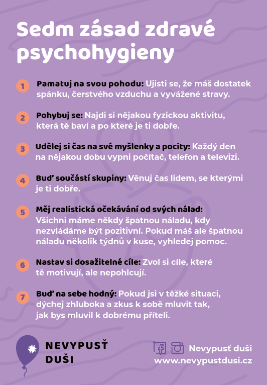 Ve spolupráci s neziskovou organizací Nevypusť duši, která se zabývá duševním zdravím a prostřednictvím zaměřených programů, nabídek pomoci, infografik a mnoho dalšího nám ukazuje, jak o něj pečovat, přinášíme studentům několik vybraných tipů na zdravou psychohygienu.