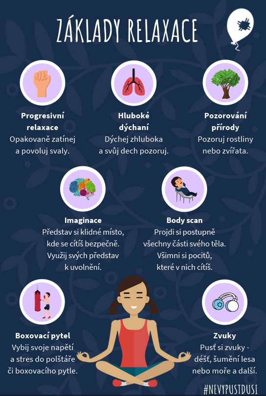 Naším posledním bodem ve spolupráci s Nevypusť duši je relaxace. Relaxaci bychom si měli dopřát nejlépe každý den – napomáhá totiž zejména se zvládáním stresu, k lepšímu soustředění a také k celkovému uvolnění. Též se jedná o skvělého pomocníka v případě problémů se spánkem a s nespavostí.