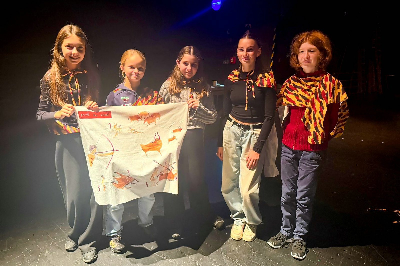 Začali od “prapůvodu”, tedy divadlo jako rituál: Program zahájil cestu v nejhlubší historii – u pravěkého loveckého rituálu. Žáci si vyzkoušeli, jak se příběhy vyprávěly před tisíci lety: s minimem rekvizit a s použitím kostýmů symbolizujících zvířecí kůže. „Bylo fascinující sledovat, jak rychle se dokázali vžít do role pravěkých lovců. Pochopili, že divadlo vzniklo z potřeby předávat důležité informace, vyjádřit emoce a posílit komunitu. Následovala ukázka prvků antického divadla, kde si žáci vyzkoušeli práci s velkou maskou, která v dávných časech pomáhala hercům přenášet emoce a zesilovat hlas v obrovských amfiteátrech.